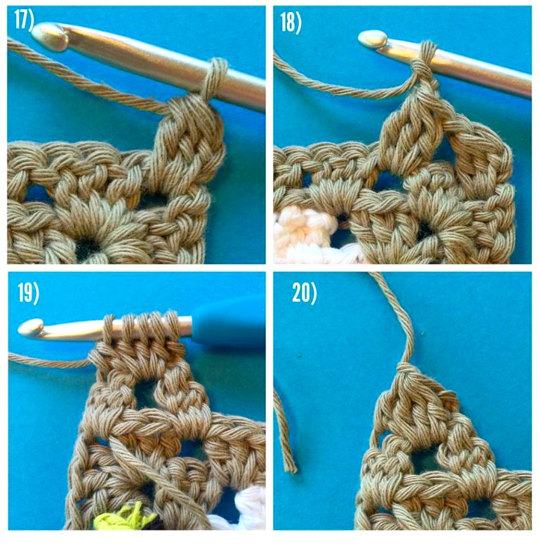 3 DC, CH2 — repeat this sequence three times to form a square.